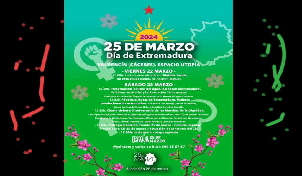 Conmemora el 25 de Marzo Día de Extremadura en Valdencín del 22 al 25 de Marzo de 2024. Disfruta de charlas, música, comida popular y mucho más. ¡Reserva tu plaza!